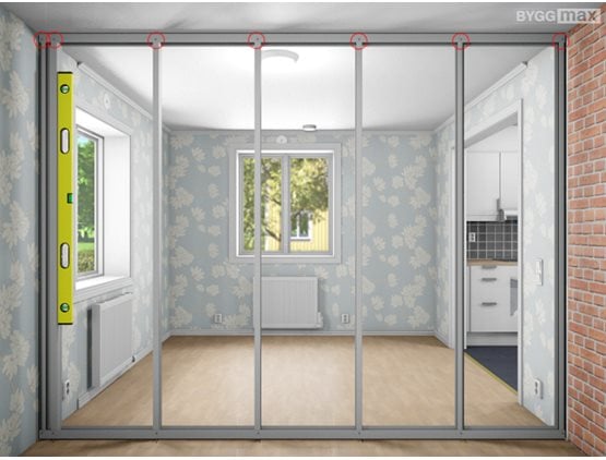 Mät ut avståndet till vägg och markera snittet på den sista skenan.