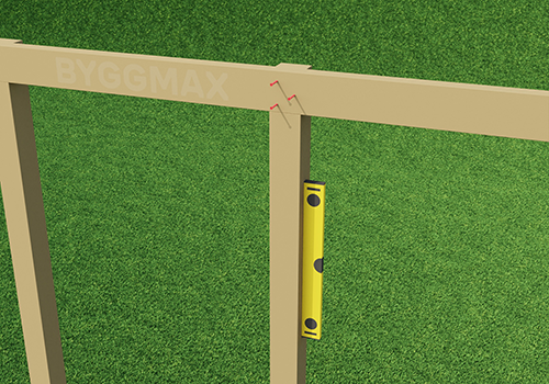 Kontrollera att stolparna är i lod och fäst sedan in den övre väggregeln i ovankant av stolpen i höjd med det bakre hammarbandet. Fäst sedan även den mittre regeln i stolparna och kontrollera att även denna är i våg.