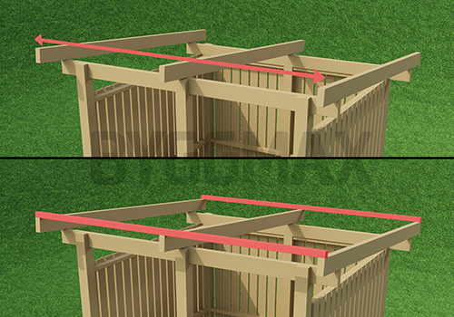 Taket ska vila på taksparrar som i sin tur vilar på de främre och bakre hammarbanden. Mät därför ut avståndet mellan hammarbandens utsidor och lägg till 40 – 60 cm till denna längd. Detta gör att du kommer att få ett överhäng i både fram och bakkant på 20 – 30 cm.