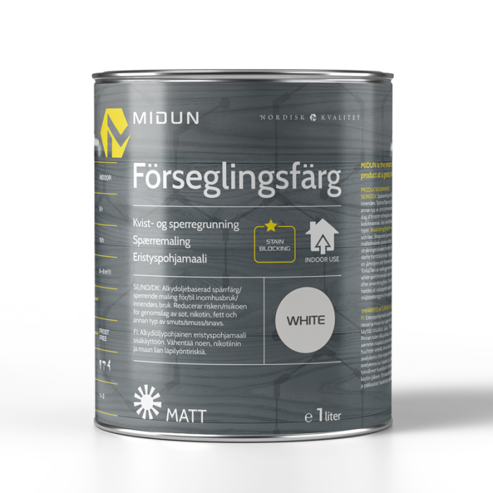 Förseglingsfärg - eller spärrfärg som det också kallas - används för att förhindra att fukt, fett och annan smuts tränger igenom din valda inomhusfärg. Miduns förseglingsfärg för inomhusbruk är vattenburen och reducerar risken för genomslag av sot, nikotin, fett och annan typ av smuts. Den reducerar även risken för kvistgenomslag och kan användas i stället för kvistlack. Kvistgenomslag är dock ett naturligt fenomen som kan uppkomma efter tid trots behandling. Denna färg kan övermålas med alla färgtyper.