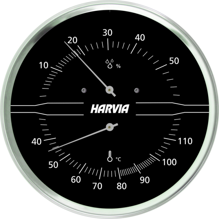 Gör din bastuupplevelse komplett med kvalitetstillbehör från Harvia. Den här eleganta termo- och hygrometern förgyller vilken bastu som helst.