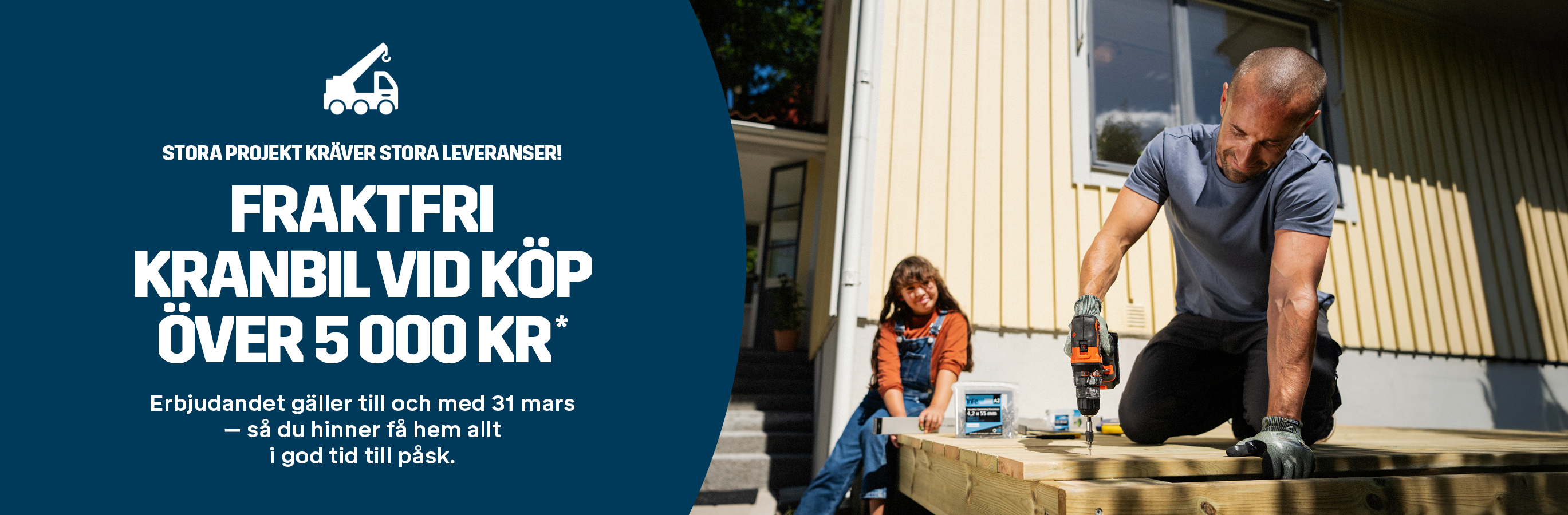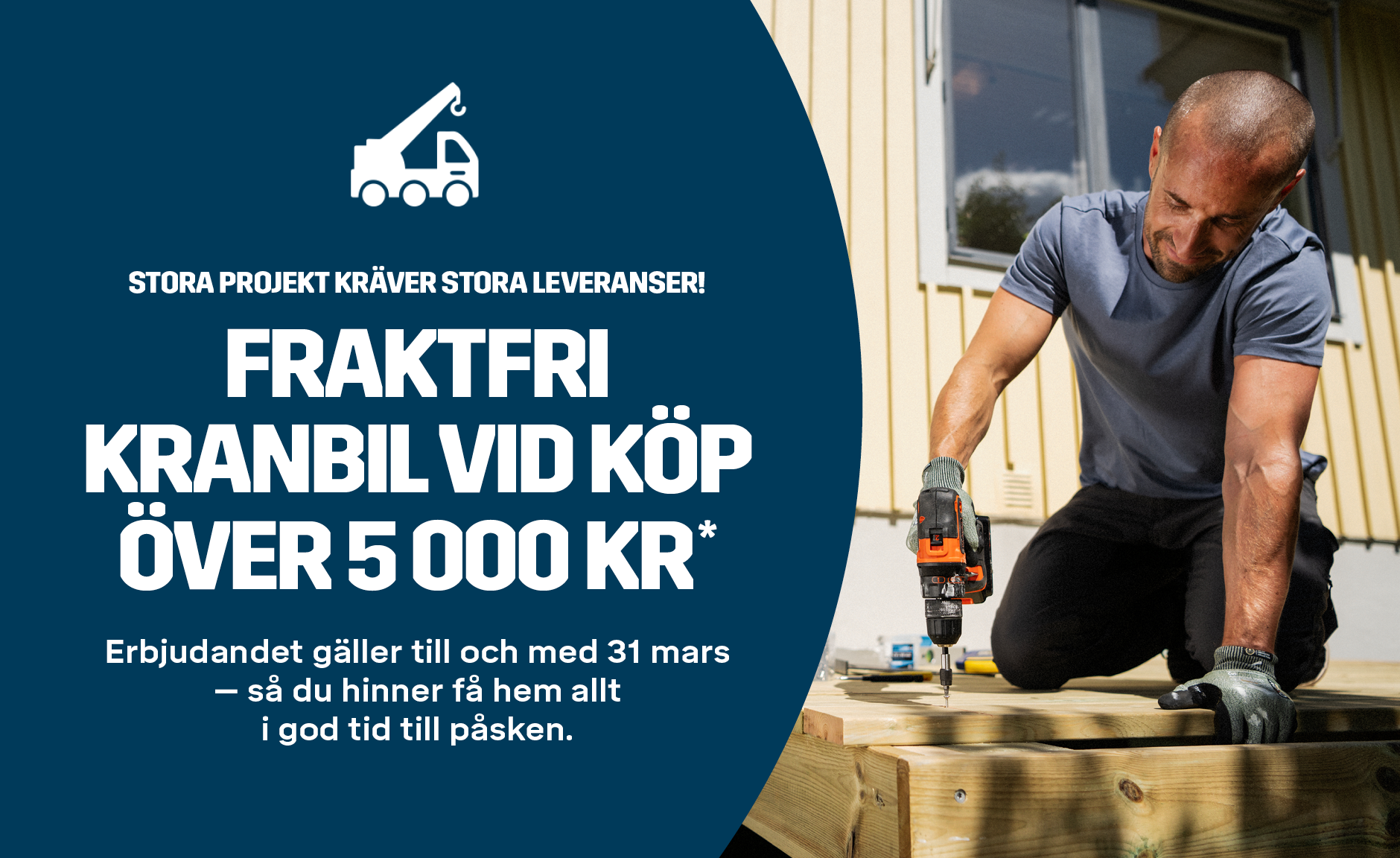 *Vi bjuder på standardleveransen upp till 15 km från din närmaste Byggmax-butik när du handlar över minsta beloppet. Bor du längre bort tillkommer en kostnad på 55 kr per km. Den kostnaden betalar du, men standardleveransen är fortfarande gratis. Erbjudandet gäller 1 mars till 31 mars.