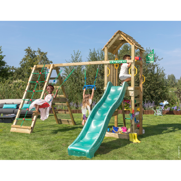 Lektornet inkluderar en spännande och krävande klätterställning där motoriken kan få fritt spel på klätterstegen eller i klätternätet, och där de två gungorna efter en härlig klättertur är redo att ge fjärilas i magen antingen genom en gunga eller en trapetsgunga där du kan utveckla dina akrobatiska färdigheter.- Inklusive klättervägg, klätterstenar, trestegstege, handtag, jordankare, borr/skruvar, beslag, skruvskydd, trätak, StarOscope™ (Teleskop), Jungle Steering Wheel™ (ratt), Jungle Gym flagga, klätterställning med en gunga och en trapetsgunga, mörkgrön rutschkana 220 cm, huvudskydd, sandlåda och manual.