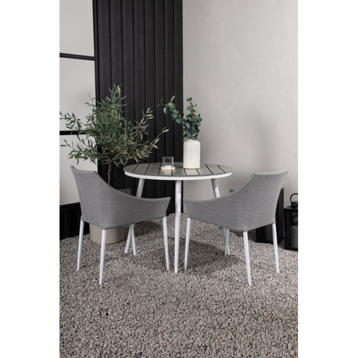 Skapa den perfekta fikaplatsen på din altan i sommar! Här kombineras tidlös design med inbjudande former i ett nätt blickfång. Matbord Break har en grå bordsskiva i grå aintwood och ett klassiskt underrede i vit aluminium. Stolarna är från serien Spoga, en stol med fokus på stil och komfort. Den inbjudande sitsen är lätt rundad i grått tyg och benen är i vitt stål. Duka ut frukosten eller kvällsfikan och njut av somriga dagar!