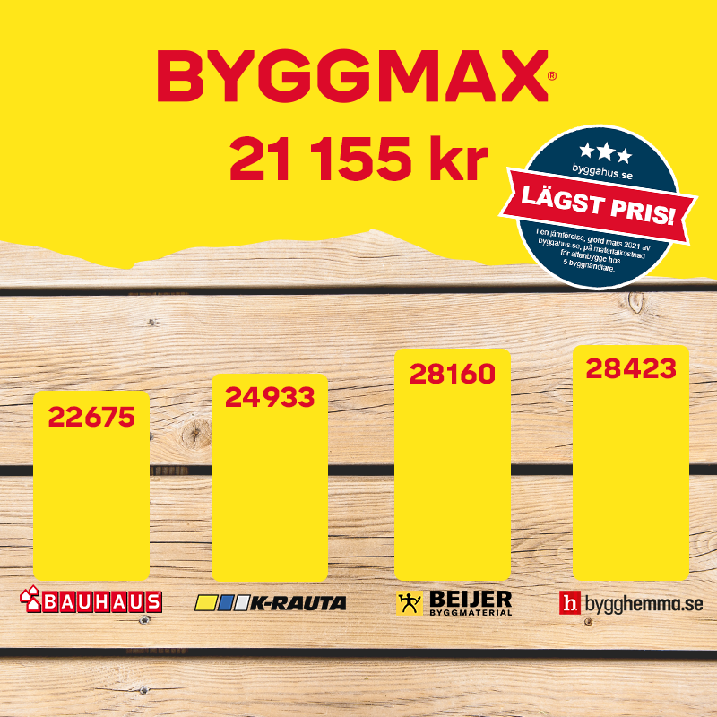 Byggmax står som segrare i en prisundersökning från byggahus.se, där materialpriser till altanbygget jämförs bland fem kända bygghandlare. I undersökningen jämförs kostnaden för en 60 kvadratmeter stor altan och hos Byggmax landar priset på 21 155 kronor, vilket är hela 7000 kronor billigare än den dyraste konkurrenten. Byggmax var även billigast på altanvirket bland bygghandlarna. Läs hela testet här!