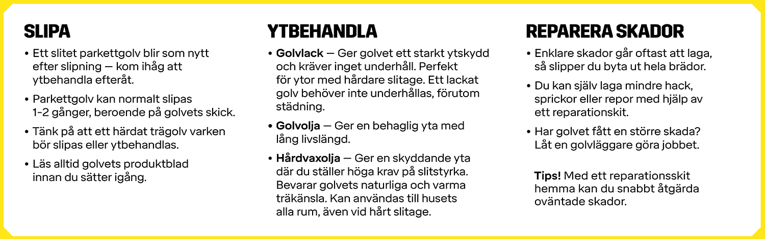 Skulle inte nämnda knep fungera återstår att antingen slipa parkettgolvet eller ersätta de skadade delarna. Om du vill slipa parkettgolvet så kontrollera först om det slipats tidigare och hur tunt slitskiktet är just nu. Ett parkettgolv kan slipas cirka 2–3 gånger innan det blir för tunt. Ett massivt trägolv kan slipas många gånger så länge inte träskiktet understiger 2,5 mm. Är skiktet i sin ordning kan golvet slipas och bli som nytt igen. Glöm inte att behandla golvet efteråt med lack eller olja.