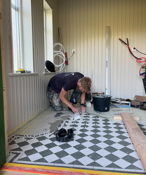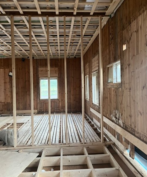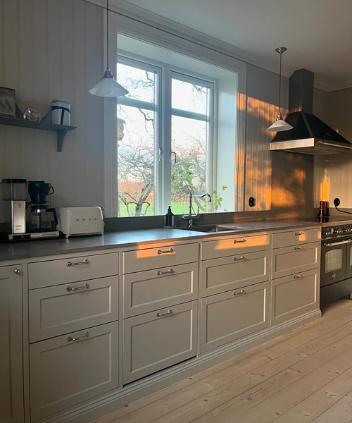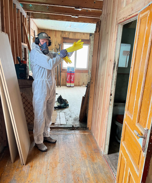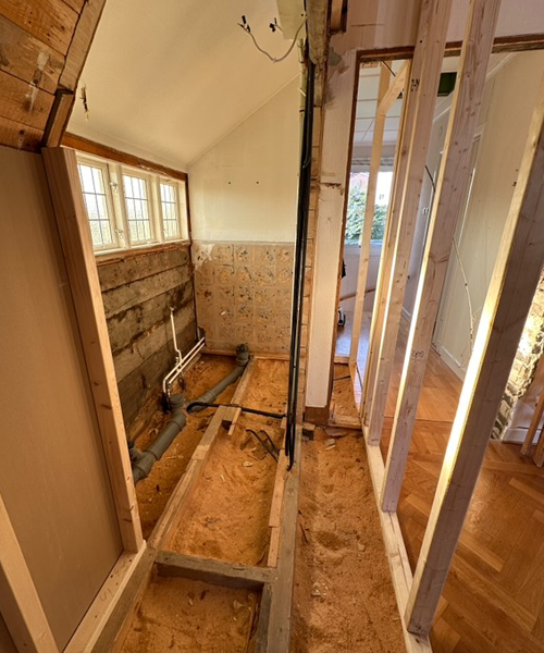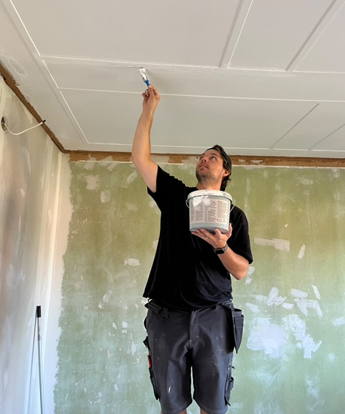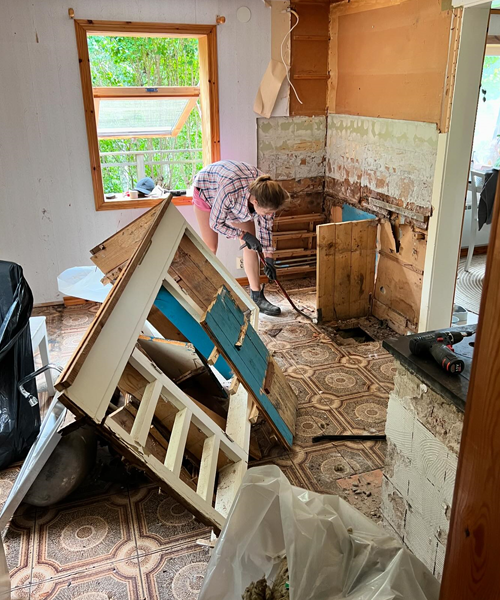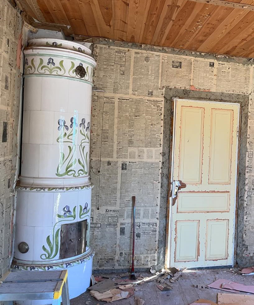 Men med ett hus i den här åldern kommer utmaningar. Fuktskador och mögel i grunden krävde en omfattande renovering, och med en stram budget valde familjen att göra det mesta av arbetet själva. Kvällar och helger har ägnats åt att göra huset beboeligt – mitt i vardagen med jobb, företag och småbarn.