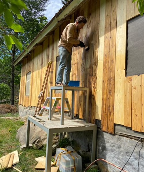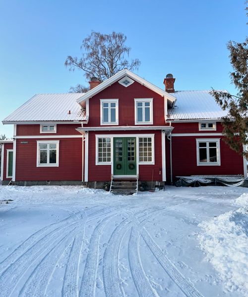 Gården har blivit ett livsprojekt. Just nu står renovering av stallets fasad i fokus, och när vintern kommer väntar nya inomhusprojekt.