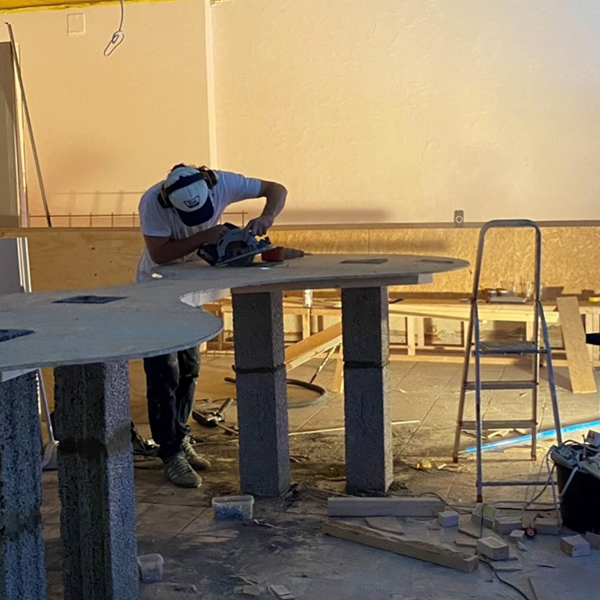 Nästan allt i lokalen är byggt för hand, med material från Byggmax. Den massiva betongbaren, som nu utgör hjärtat i restaurangen, är ett resultat av timmar av arbete och ett starkt öga för detaljer. Visionen? En plats där hantverket får tala för sig själv, där atmosfären är avslappnad och maten i fokus.