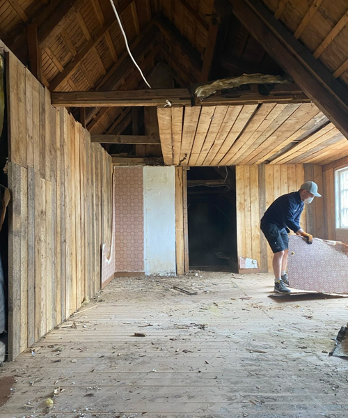 Det lilla huset, på knappt 45 kvadratmeter, hade sett bättre dagar. Men trots att mycket behövde åtgärdas gick det att bevara både stomme, tak, fönster och delar av fasaden. För att hålla nere kostnader och samtidigt värna om husets historia återanvänder de material, köper begagnat och prioriterar traditionella byggmetoder med naturliga material.