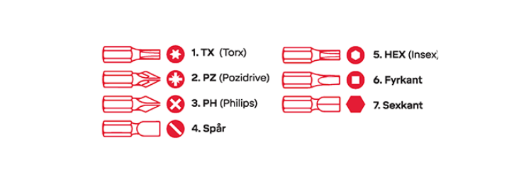 Att välja rätt bits till skruven du ska använda är avgörande för en smidig och effektiv skruvning. Bitsen ska matcha skruvens spårtyp och och storlek för att undvika skador på skruvhuvudet och för att säkerställa ett stabilt fäste. Att ha ett brett utbud av bits i olika storlekar och former är därför A&O för ett smidigt byggprojekt. Några av de vanligaste spårtyperna är spår, philips, torx, hex, fyrkant, sexkant och insex. För att slippa hinder när du bygger är det bra att se till att du har rätt skruvmejslar och bits hemma för olika typer av spår.