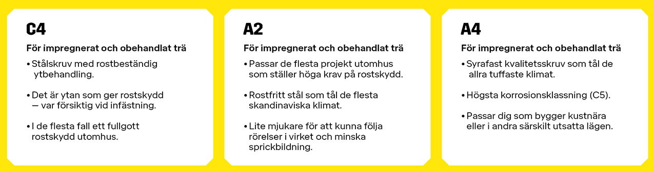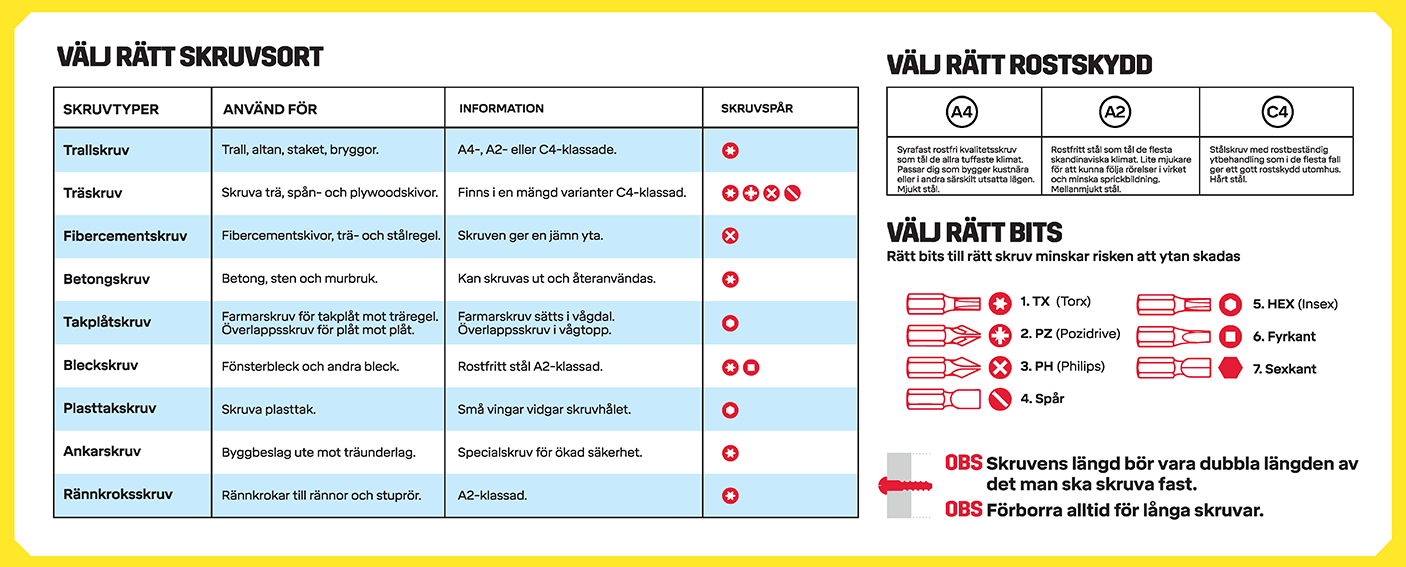 Läs vår guide och få en bred överblick över olika typer av skruv. Med hjälp av den kan du välja rätt skruv till ditt byggprojekt.