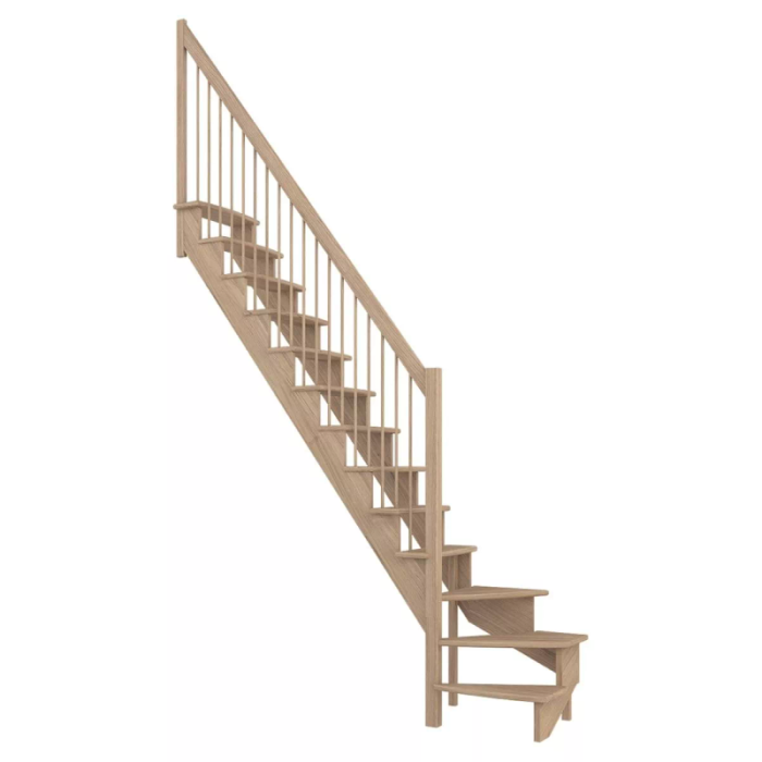 Perfekt där du inte har mycket plats, eller bara önskar en snygg trappa som inte tar upp för mycket plats. De öppna vanger ger et modern och elegant design, som passar för alla hem. Trappan är gjort av massiv ek och förseglad med lack för att uppnå en beständig och underhållsvänlig yta. Stegen är 21 cm djupa och lätt rundade för att uppnå en bekväm yta. Lyon trappan finns som rak eller svängd antigen till höger eller vänster. Båda typ har 13 steg, och en maximal höjd på 286 cm. Med en stegbredd på äntigen 65 eller 75 cm , kan du välja precis den trappa som passa för dit hem.