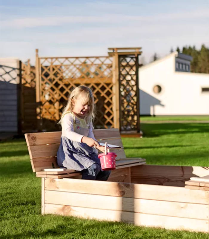 Vi erbjuder sandlådor med och utan lock. Du hittar även sandlådor med lock som kan fällas upp och bli till bekväma sittplatser. Smart va?